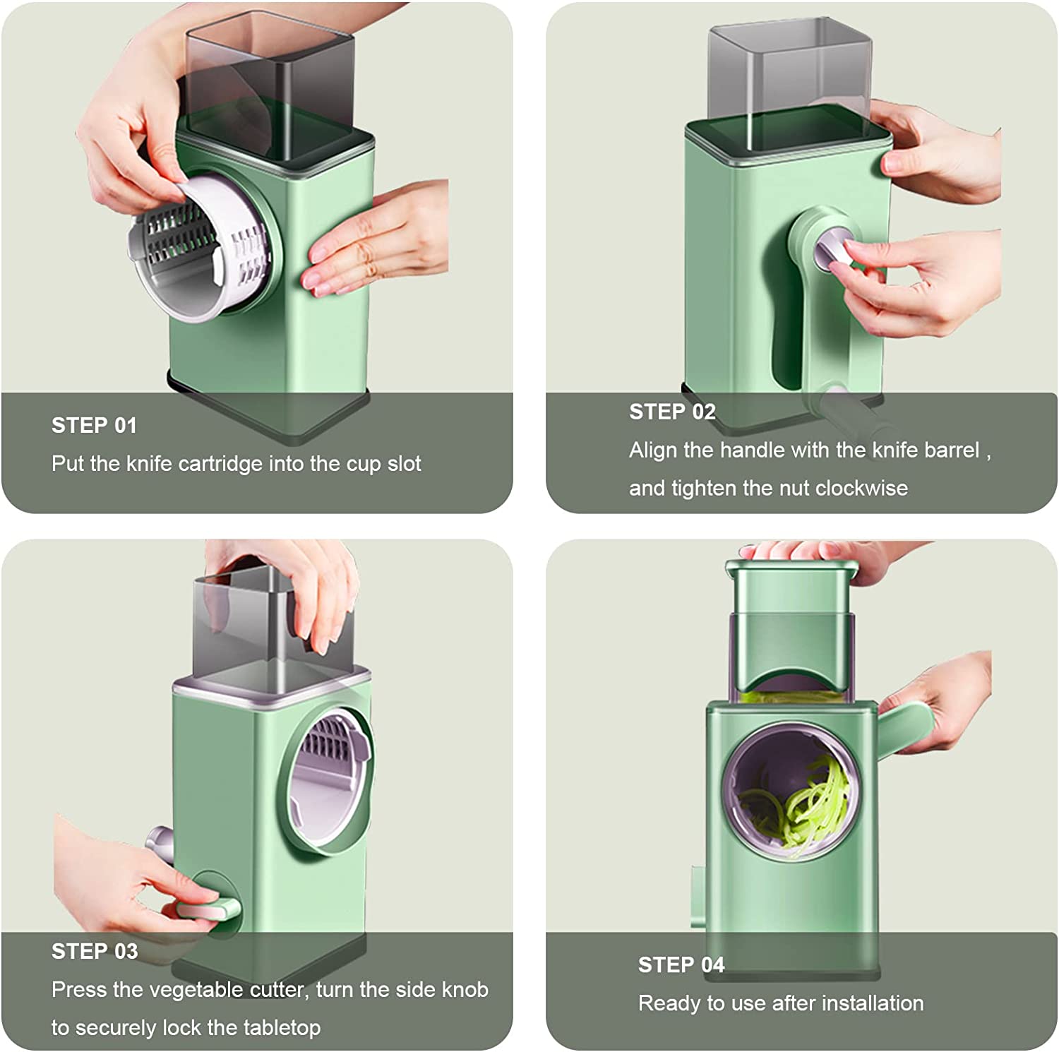 The grater is manually rotated with a crank and comes with 3 different drums that you can switch between depending on the desired result: 2 graters of different sizes and 1 disc